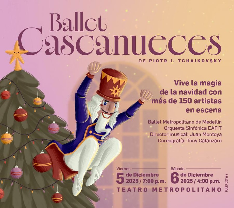 En la noche de navidad los muñecos que los niños reciben de regalo cobran vida con la música de Tchaikovsky. El Cascanueces, un simpático soldadito de juguete se convertirá en un apuesto príncipe que llevará a Clara al país de los dulces, en donde vencerá al Rey de los Ratones.Disfruta en familia de este clásico navideño junto al Ballet Metropolitano de Medellín.